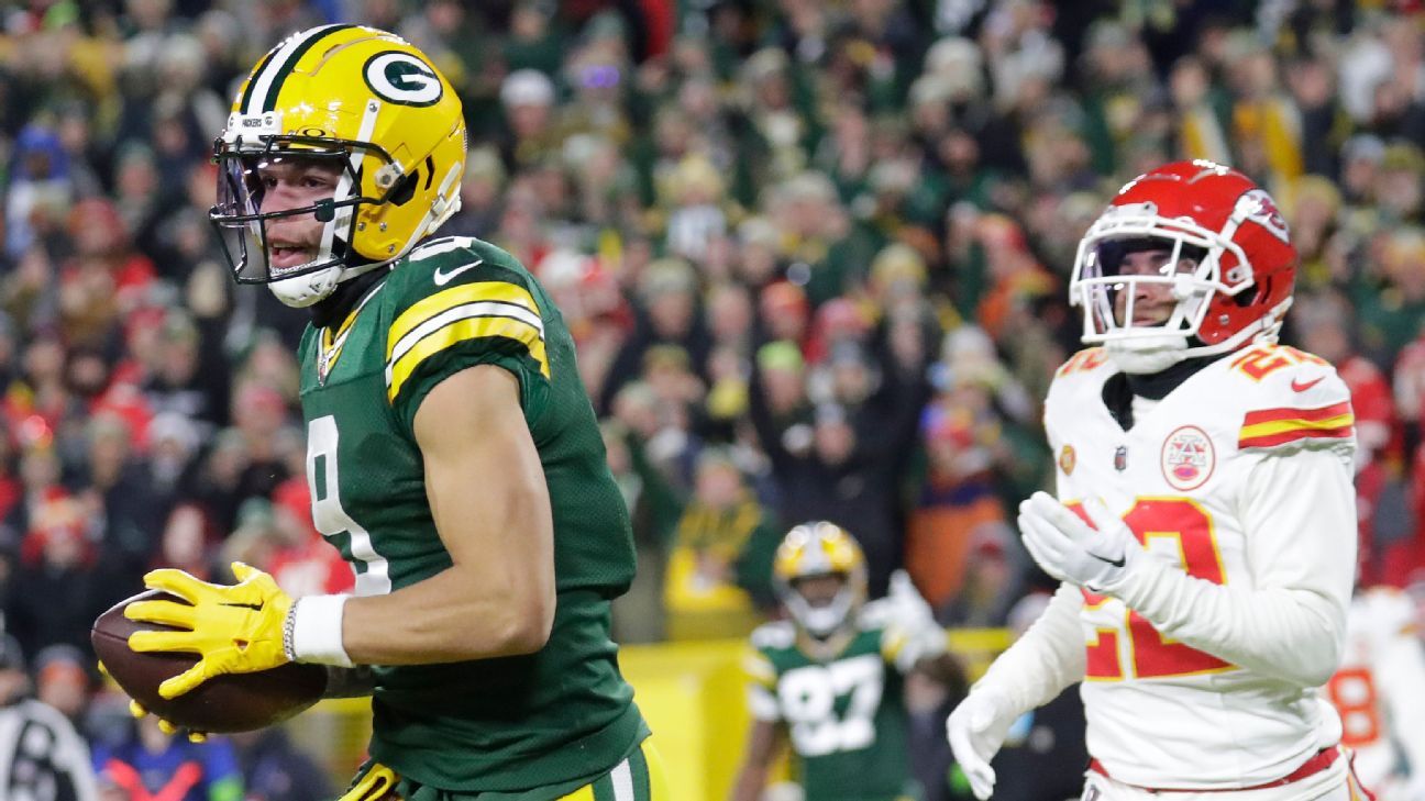 O mesmo recebedor do Green Bay Packers que não conseguiu fazer uma recepção contestada fez uma recepção difícil contra o Kansas City Chiefs na noite de domingo. Com o cornerback Joshua Williams em cobertura apertada e Watson correndo sem espaço na parte de trás da end zone, o quarterback Jordan Love lançou um para seu recebedor do segundo ano.
